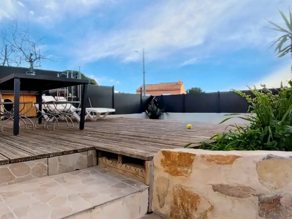 Terrain tout autour avec très belle terrase devant, plein sud. Garage pour une voiture. Places de parking à l’intérieur.