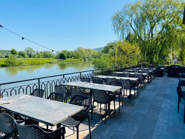 le bar du restaurant ,ainsi qu’une grande salle pouvant servir plus de 100 couverts, avec un accès à des terrasses spacieuses en bordure du Doubs. La cuisine professionnelle, les réserves, trois chambres froides, des toilettes, une laverie et une chaufferie complètent ce niveau. Des annexes sont également présentes.