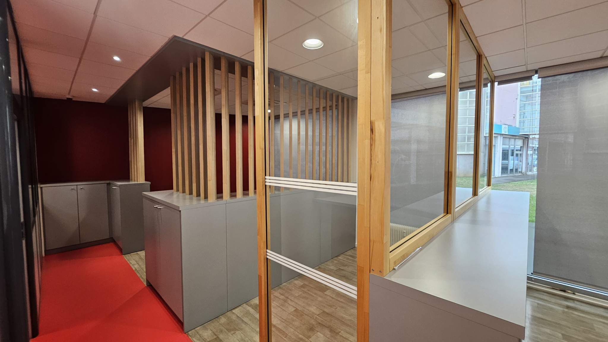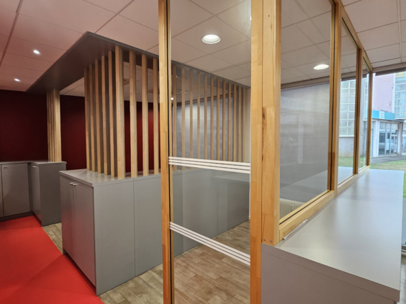 Aménagement optimal : accueil, 3 bureaux fermés, espace coworking et espace pause