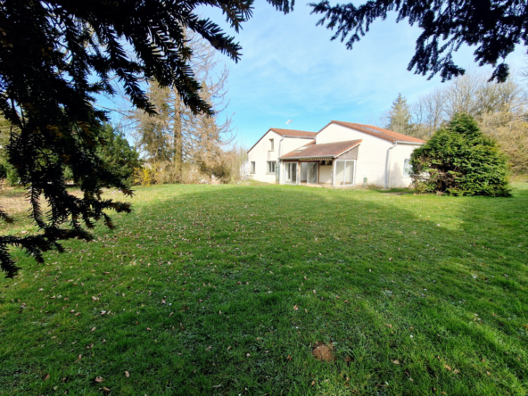 grand terrain arboré plat (ancien terrain de tennis) donnant sur une terrasse abritée .