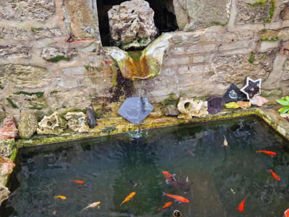 La cuisine et les deux chambres donnent sur une grande terrasse pavée avec une source naturelle qui coule toute l’année dans un petit bassin.