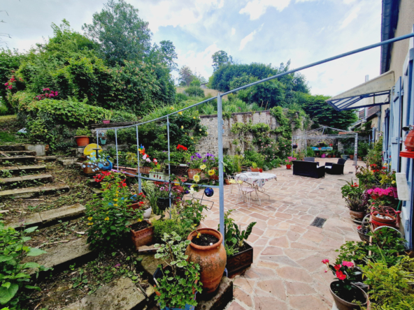 Le terrain surplombe la maison et un escalier permet d’accéder directement au parc du château, idéal pour des promenades ou pour se rendre au musée, à la médiathèque ou à l’hôtel de ville.