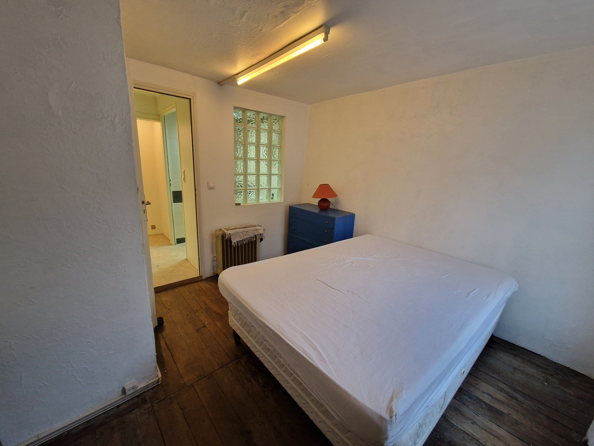 Eerste verdieping: 60 m2 leefruimte bestaande uit een keuken die uitgeeft op een woonkamer, een doucheruimte met douche, wc en wastafel, en een slaapkamer.
