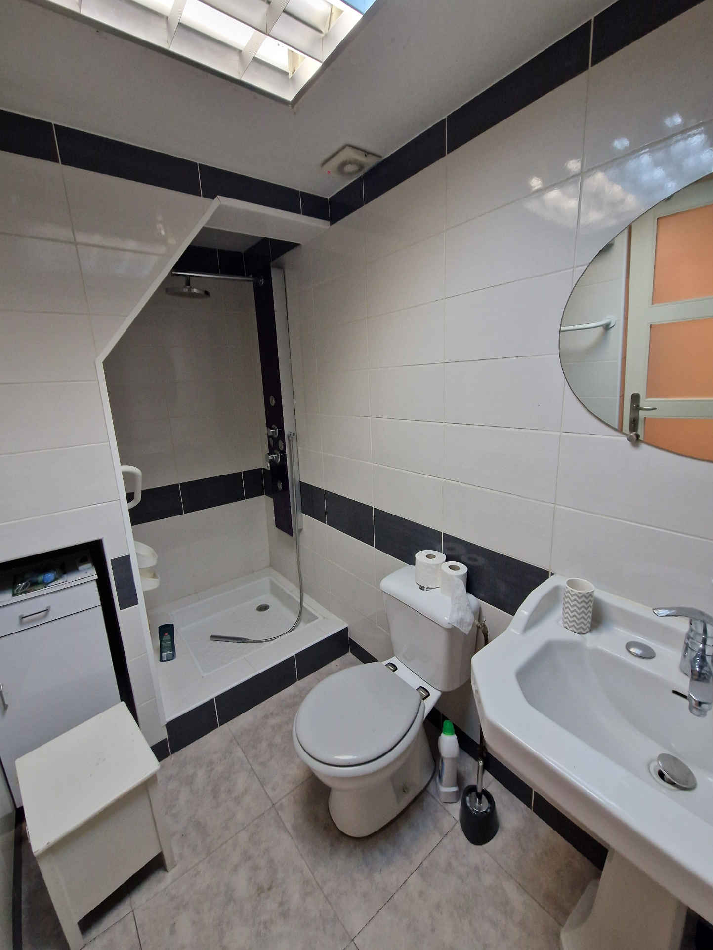 Premier étage : Partie habitable de 60 m2 comprenant une cuisine ouverte sur un séjour, une salle d’eau avec douche, WC et lavabo, et une chambre.