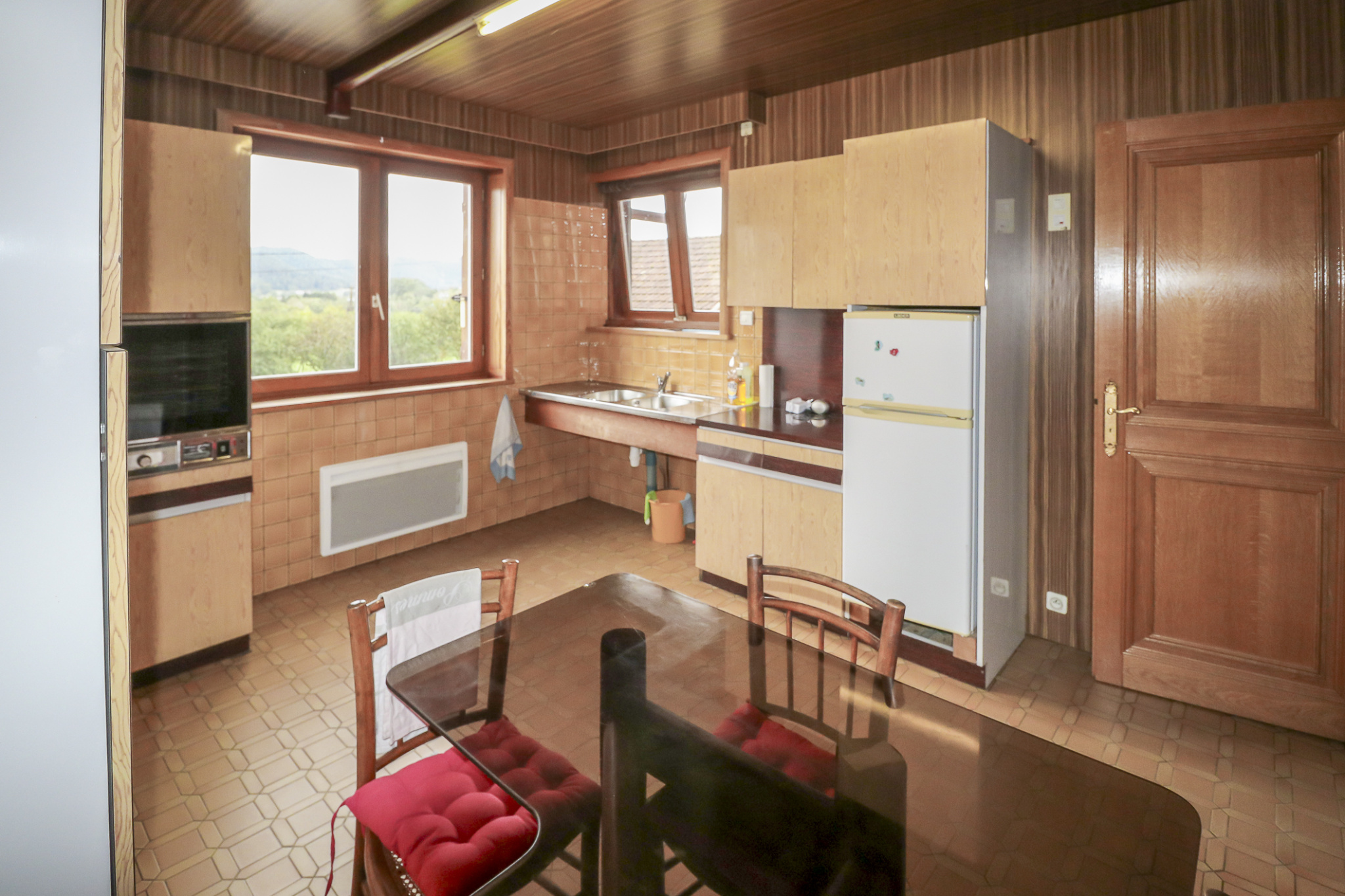 – au rez-de-chaussée: un grand salon/salle à manger de 29m2 avec sa cheminée, une cuisine équipée, deux chambres, une salle de bain et une terrasse de 25m2.