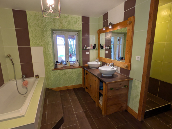 Étage : Grande mezzanine (possibilité d’aménager une cinquième chambre, ainsi qu’un coin bureau), trois chambres plus une pièce aménageable de 9m2.