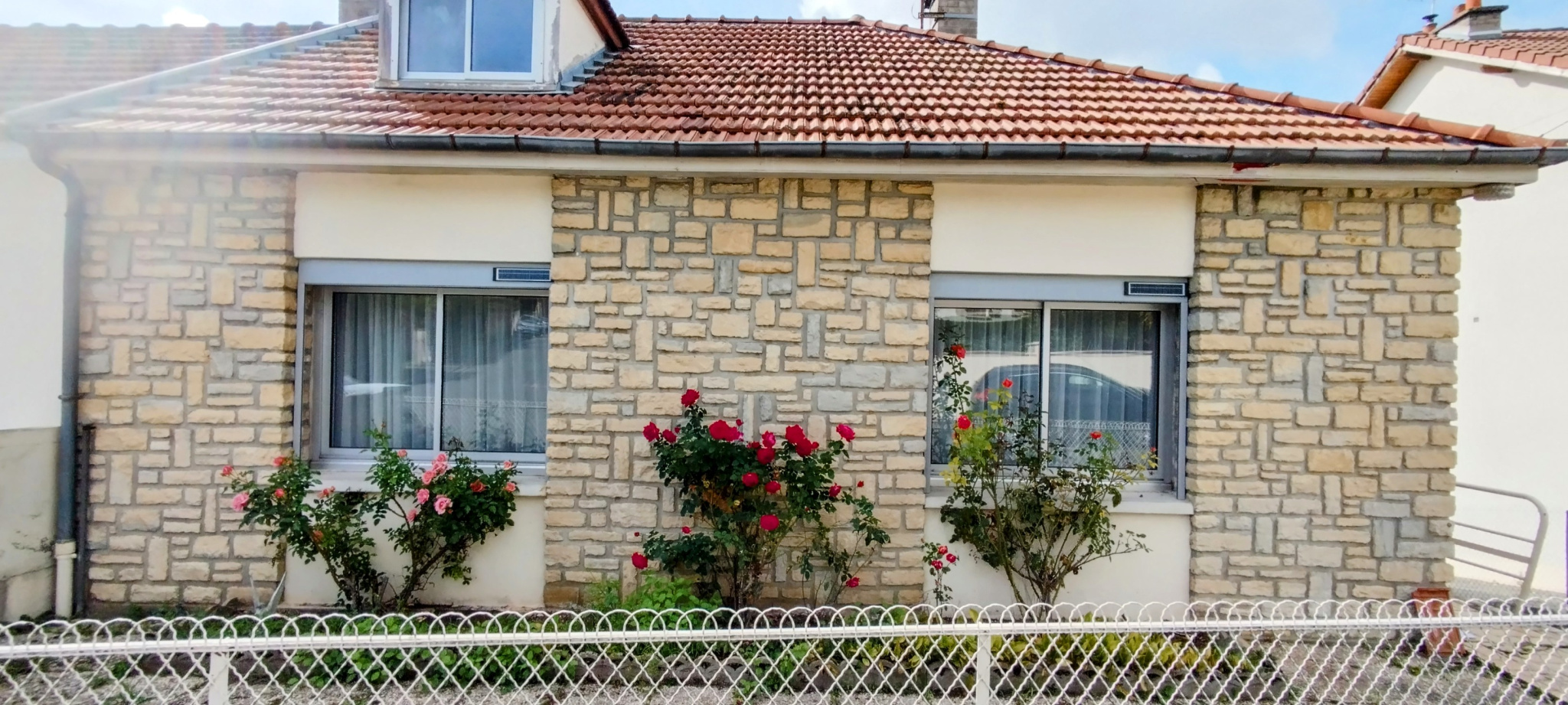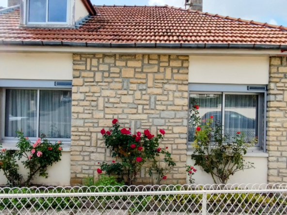 Maison trois chambres, 93 mètres carrés habitables. Quartier très calme. Au rez-de-chaussée une entrée, une cuisine, un grand séjour, deux chambres, une salle de bains, WC séparés. Au premier étage une chambre sous combles, grenier en trois pièces. Sous-sol complet avec deux garages, une chaufferie, une cave et un bûcher. Beau jardin derrière et courette devant.
