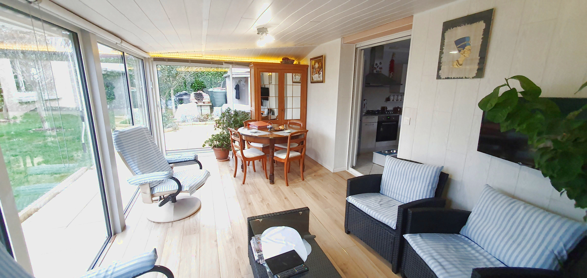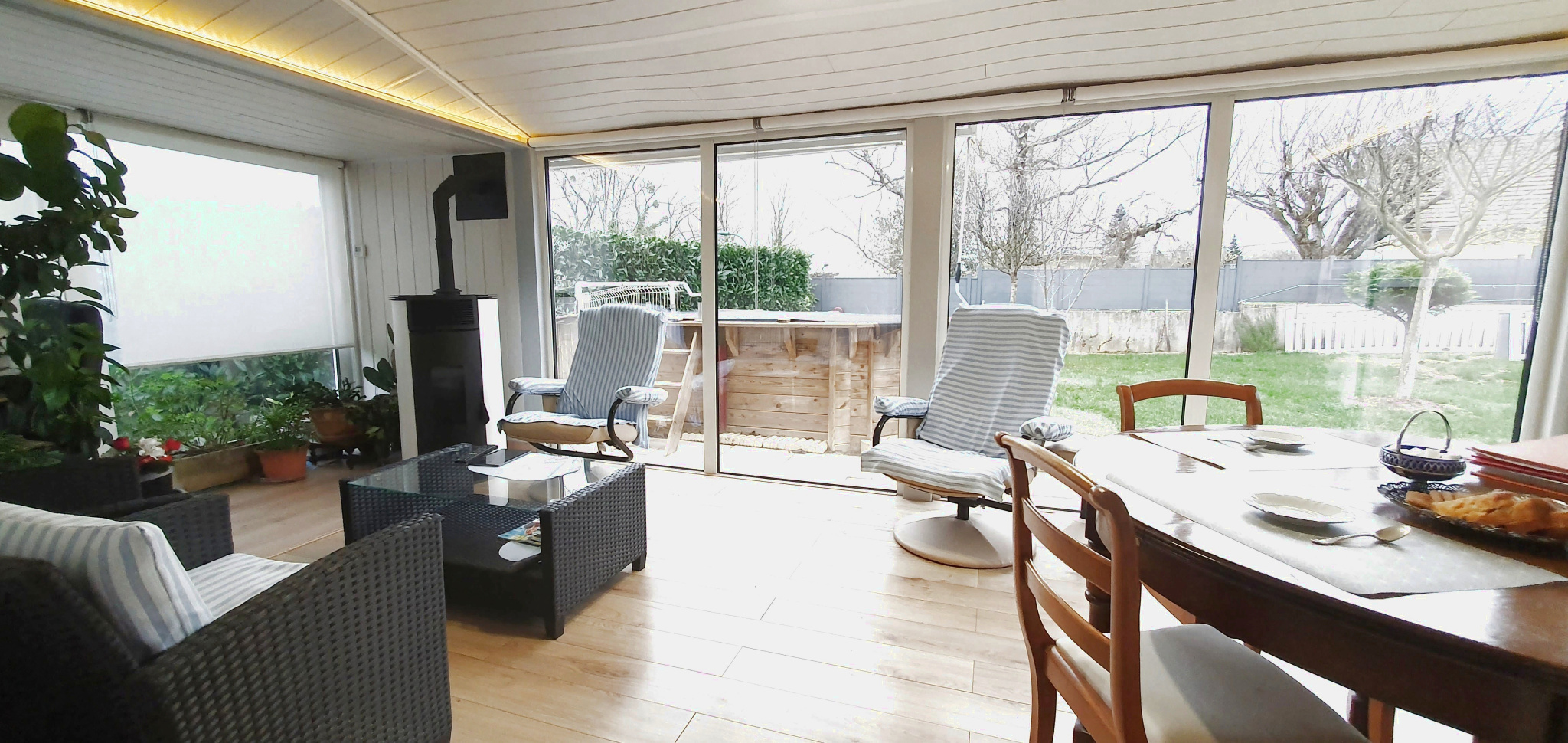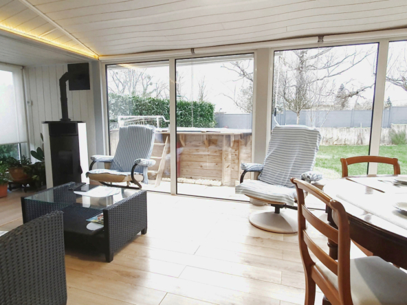 Une véranda de 19 m2, chauffée par un poele à pelet, ainsi qu’un garage fermé complètent l’ensemble.