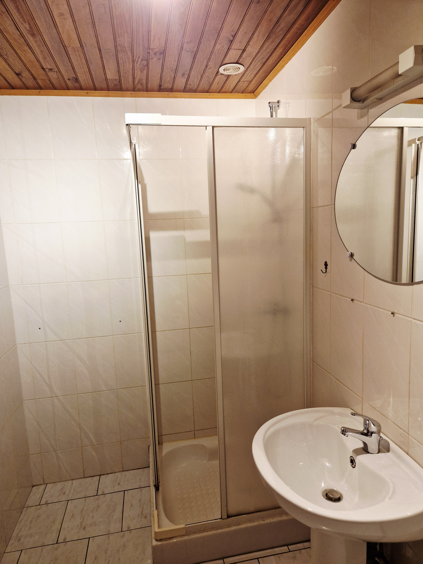 Begane grond: grote gezellige keuken, lichte woonkamer, doucheruimte, toilet.
