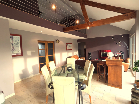 Les volumes généreux et la luminosité naturelle subliment le salon séjour de 45 m2 avec mezzanine, véritable pièce maîtresse de la maison.