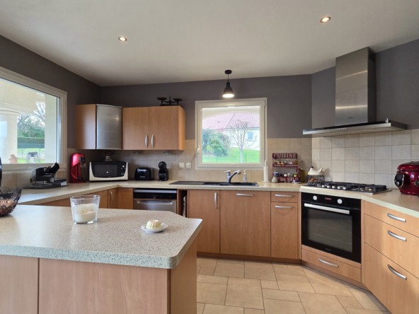 La cuisine séparée, parfaitement fonctionnelle et spacieuse, s’intègre harmonieusement à l’espace de vie.