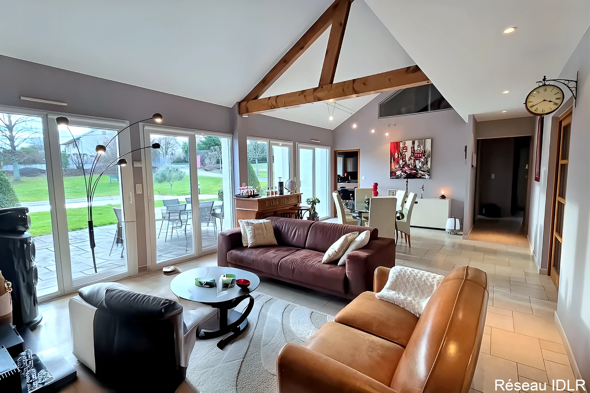 Les volumes généreux et la luminosité naturelle subliment le salon séjour cathédrale de 45 m2 avec mezzanine, véritable pièce maîtresse de la maison.