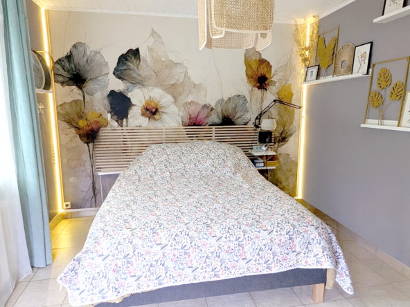 La partie principale propose une pièce de vie lumineuse de 47 m2 avec insert bois, une cuisine attenante, deux chambres au rez-de-chaussée, une salle de bains, un bureau avec pièce d’eau et un dressing. L’étage accueille quatre chambres supplémentaires ainsi qu’une salle d’eau avec WC. La maison est habitable sans travaux et bénéficie d’un chauffage économique par chaudière à granulés (DPE C).