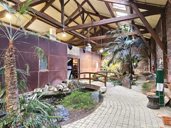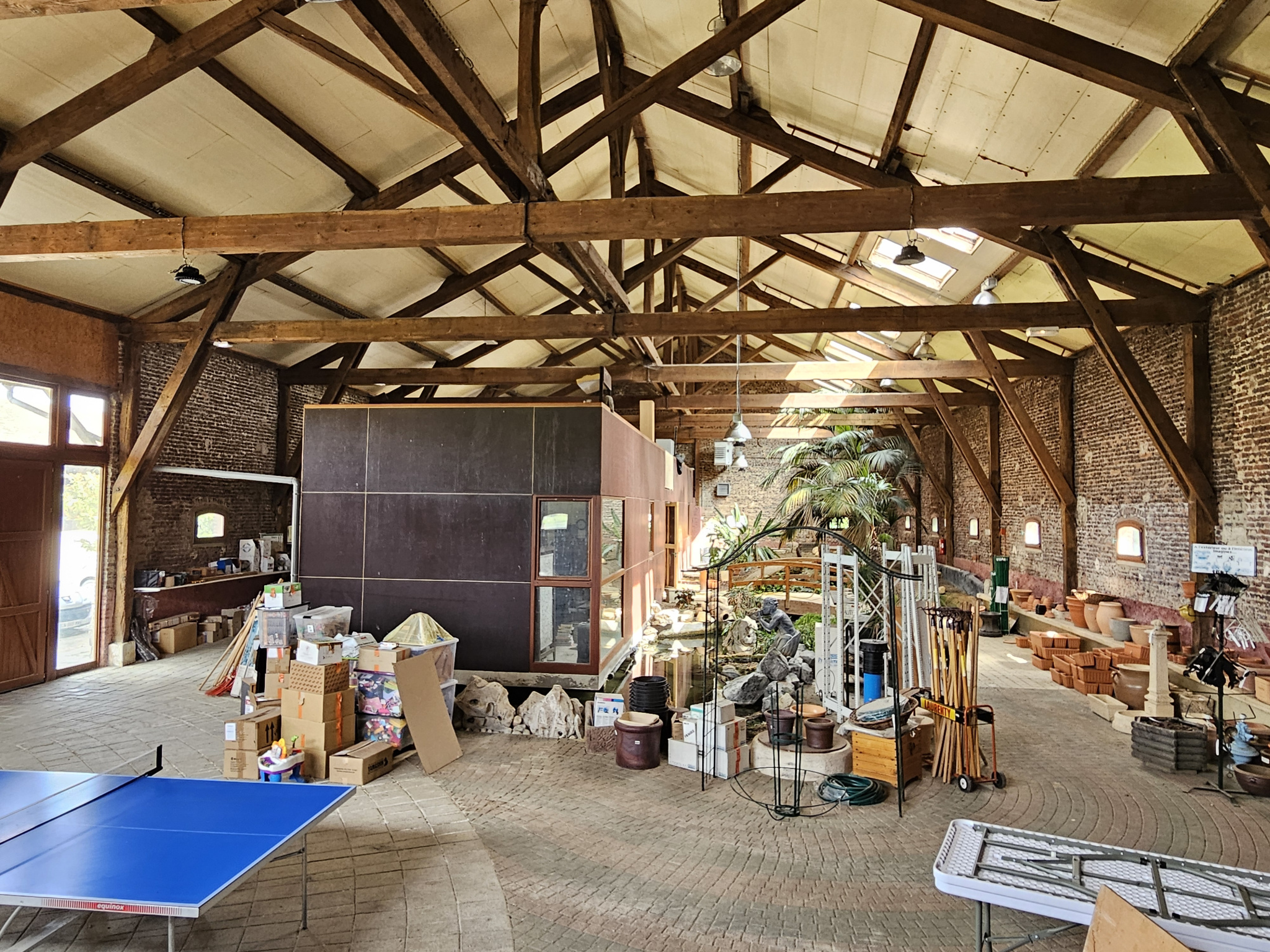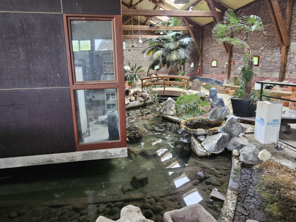 A l’intérieur, sol en pavés, bassin à carpe et des plantations diverses avec une partie bureau en préfabriqué construite sur une dalle béton. Possibilité de construire une habitation, un restaurant, des ateliers… à l’intérieur du bâtiment en faisant les démarches de changement de destination auprès de l’urbanisme (magasin à résidence par exemple).