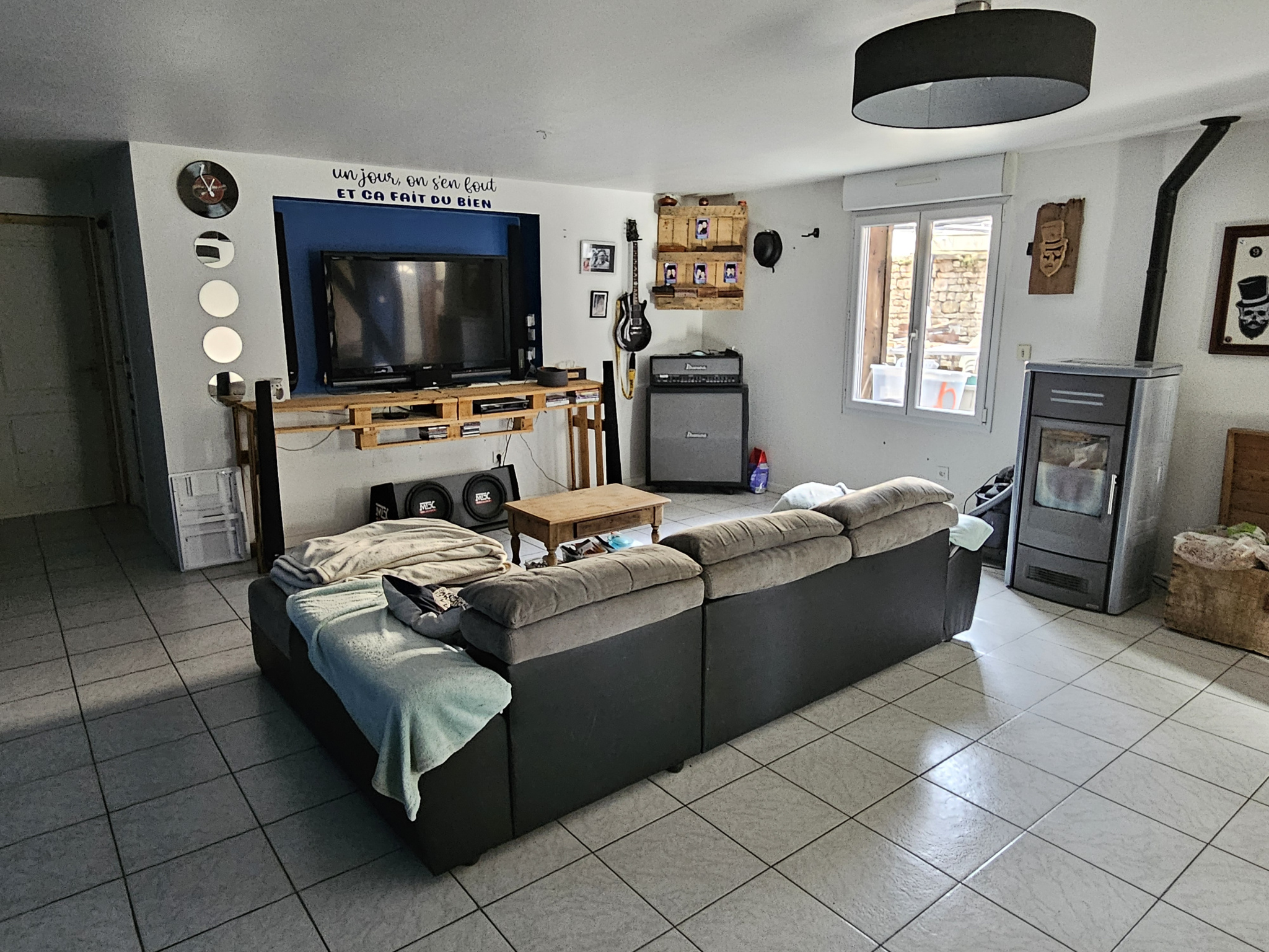 Double vitrage avec volets roulants électriques, chauffage électrique et poêle à granulés, tout à l’égout.