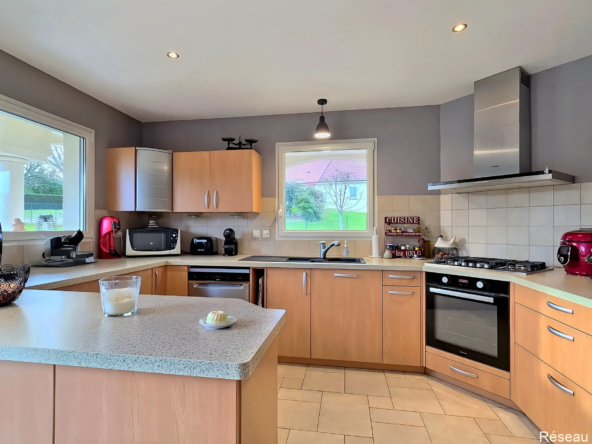 La cuisine séparée, parfaitement fonctionnelle et spacieuse, s’intègre harmonieusement à l’espace de vie.