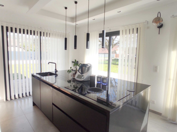 Une vaste pièce de vie de 69 m2, lumineuse, avec cuisine équipée ouverte sur le salon/séjour, prolongée par de grandes baies vitrées donnant accès direct au jardin.
