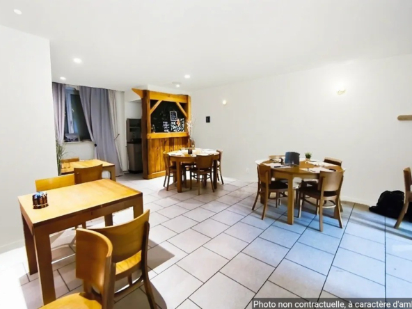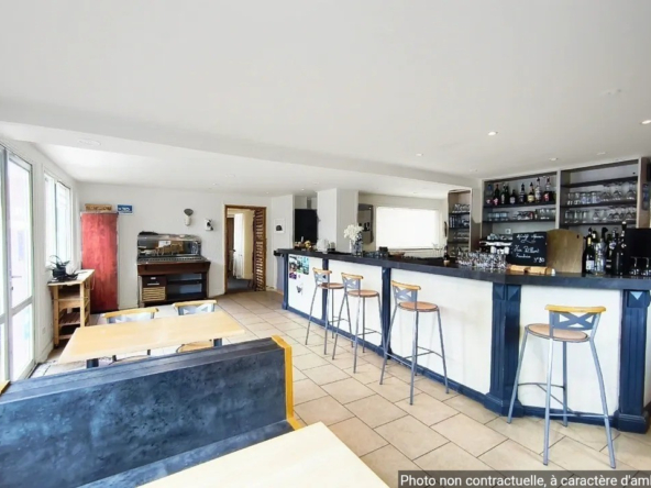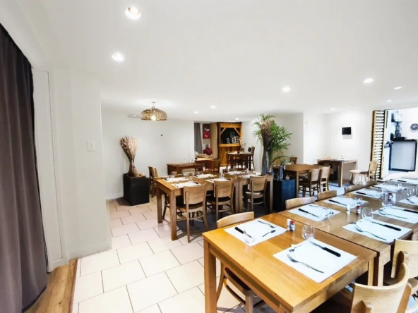 Deux belles salles lumineuses pour 70 couverts, Bar convivial pouvant accueillir 20 personnes Accès PMR Cuisine professionnelle entièrement équipée (liste du matériel sur demande) Four à pizza en briques, idéal pour diversifier l’offre