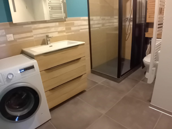 Au RDC : Jolie pièce de vie lumineuse, cuisine ouverte équipée, buanderie, placard de rangement, salle d’eau.