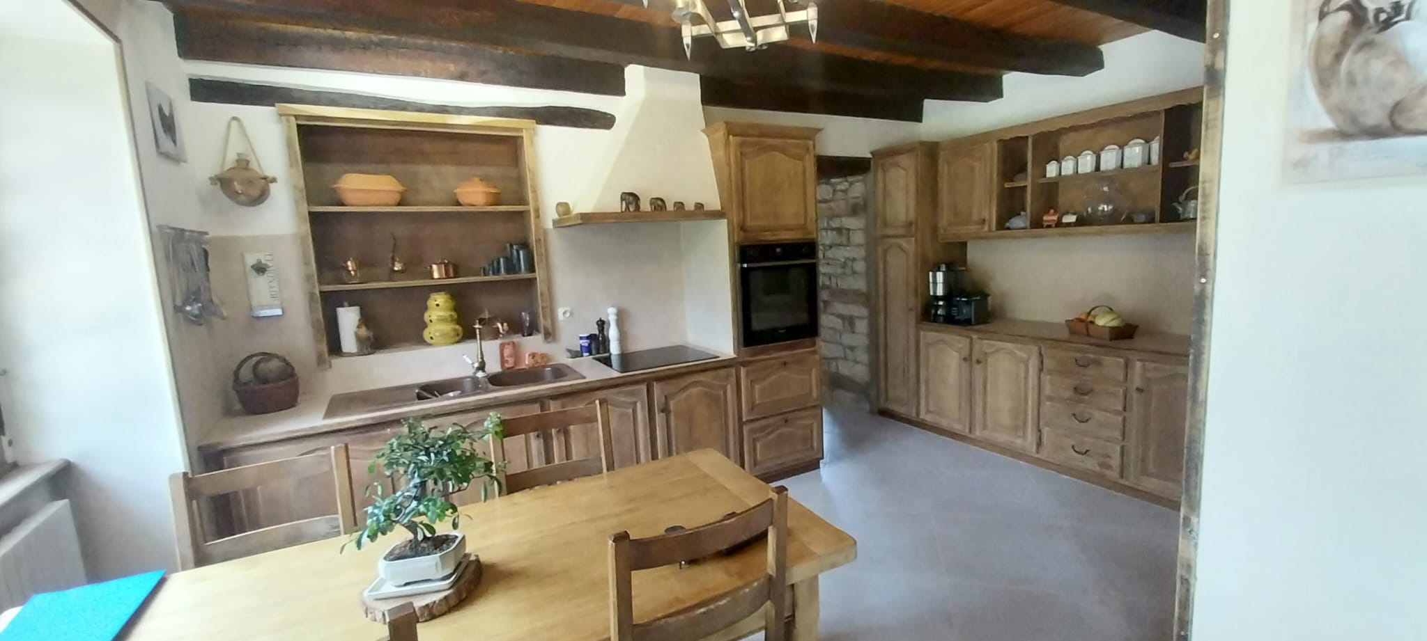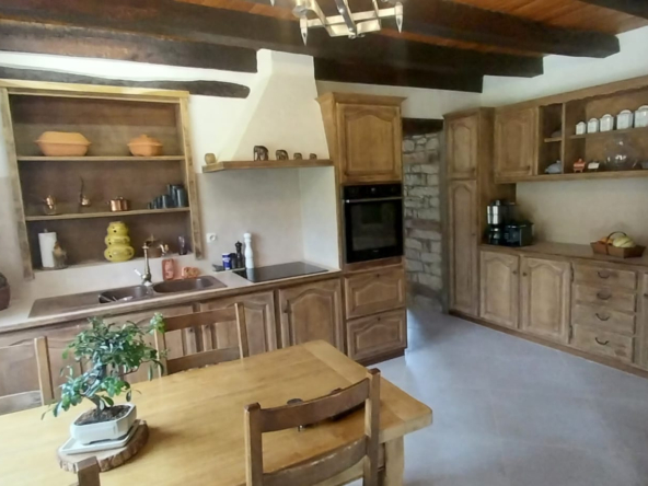 La maison en pierres apparentes développe 253 m2 habitables et s’ouvre sur une entrée, une cuisine aménagée et équipée, un grand salon-séjour aux poutres et murs en pierres, une salle d’eau et des toilettes. À l’étage, trois chambres, une salle de bains, un second WC, un espace bureau ouvert et une grande pièce de 60 m2 offrent de nombreuses possibilités d’aménagement. La suite comprennent une buanderie, un cellier, deux garages spacieux avec rangements, un grenier et une chaudière à bois neuve avec ballon tampon.