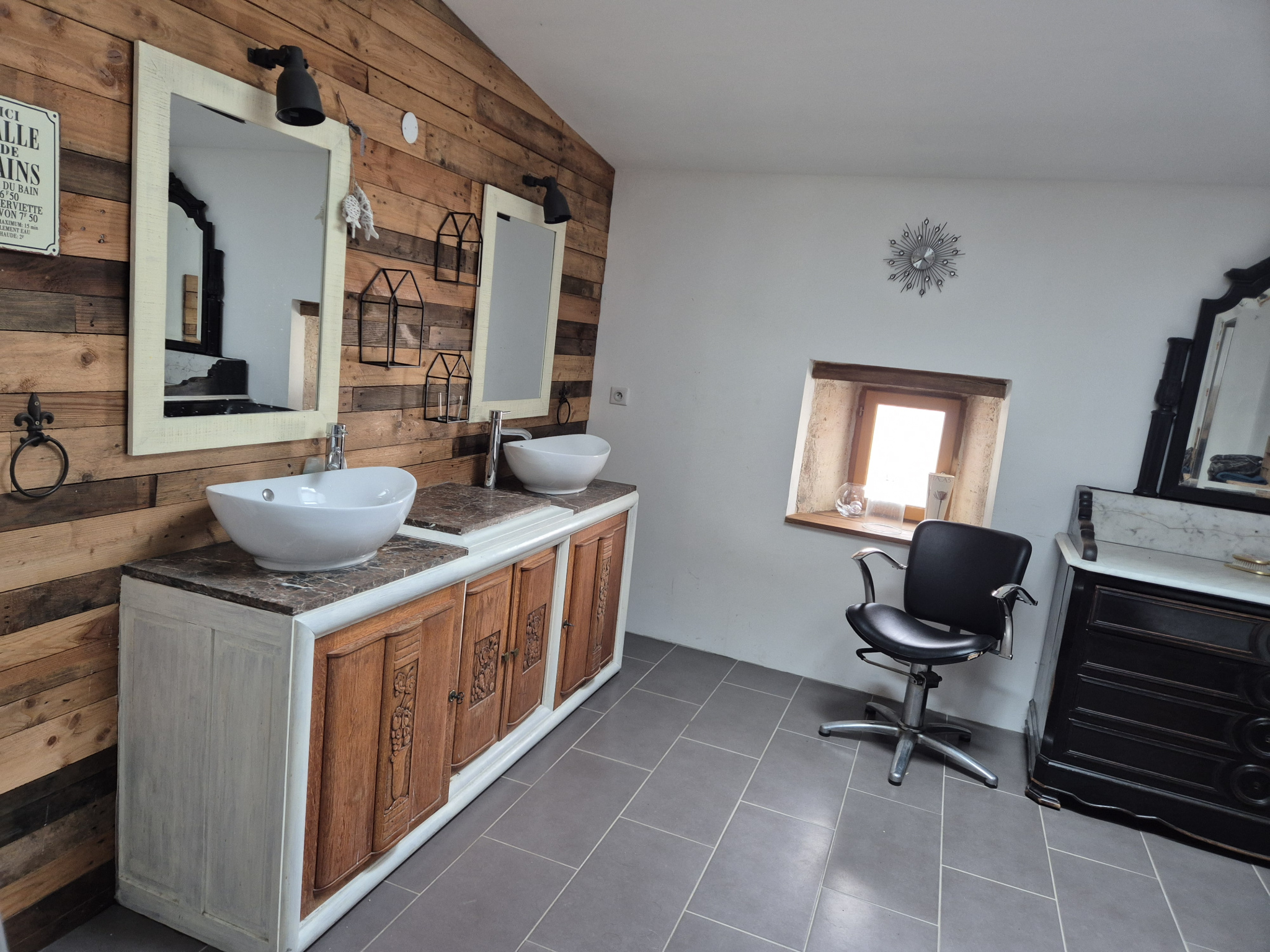 A l’étage : un vaste palier avec coin bureau, 3 belles chambres, une salle de bains généreuse avec baignoire + douche + double vasques, une bibliothèque ou salle de jeux et des wc séparés.