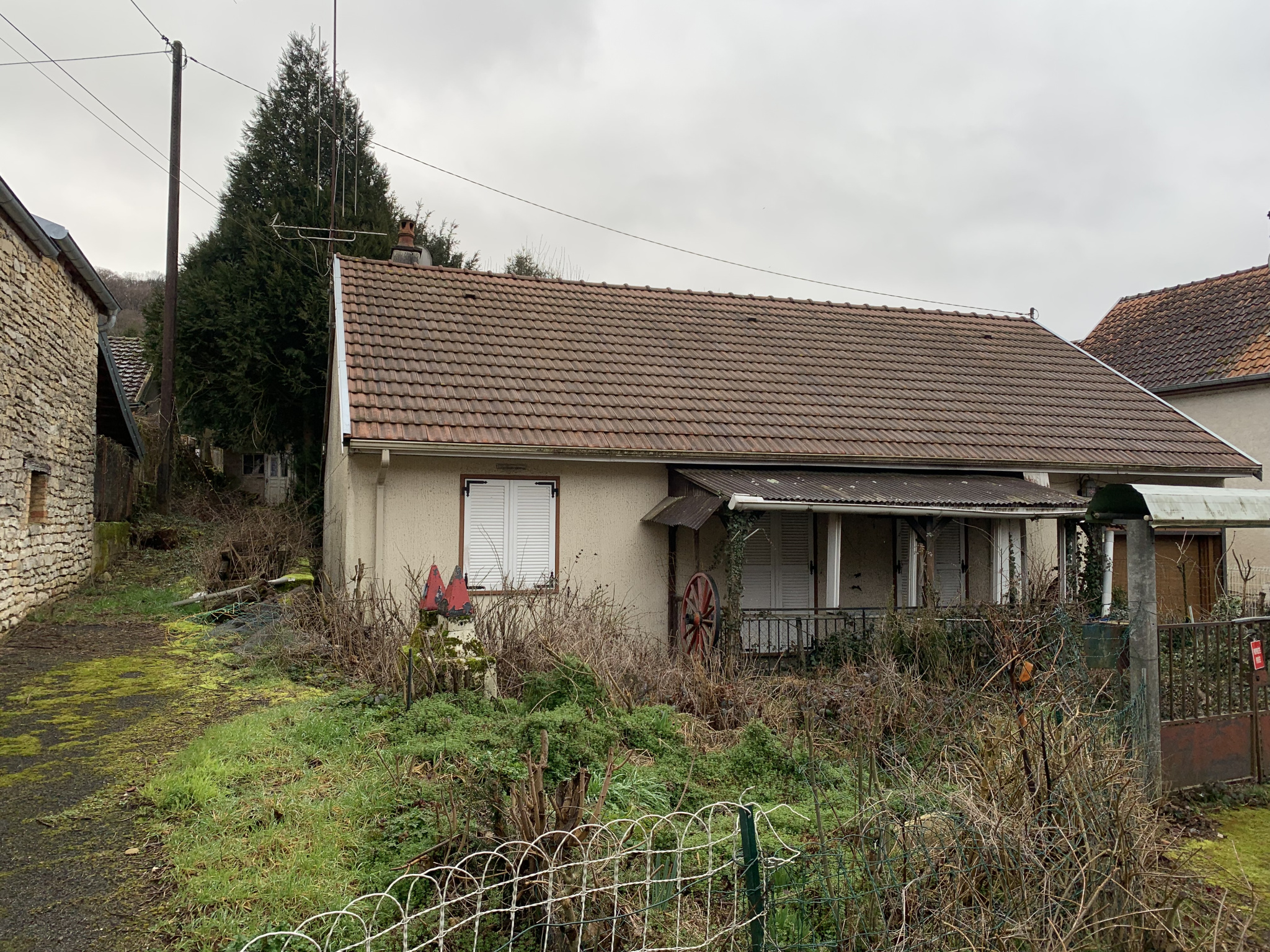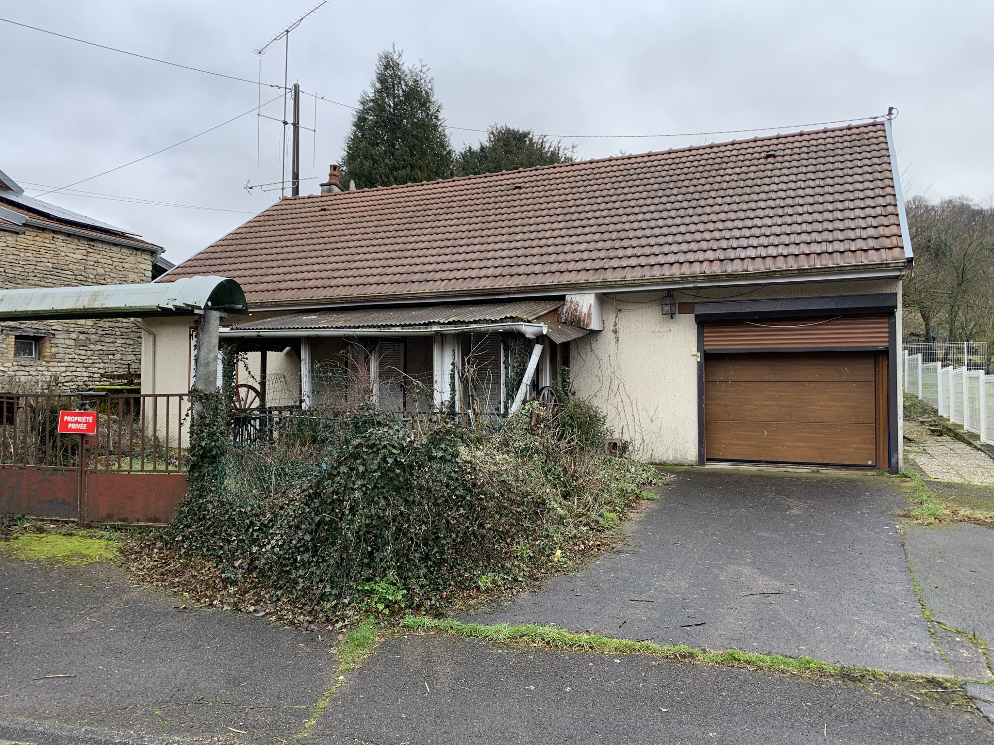 Maison de plain pied, à rénover entièrement, composée d’une cuisine, 1 salon/séjour, 3 chambres, 1 WC, salle de bain et un garage.
