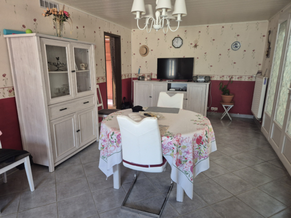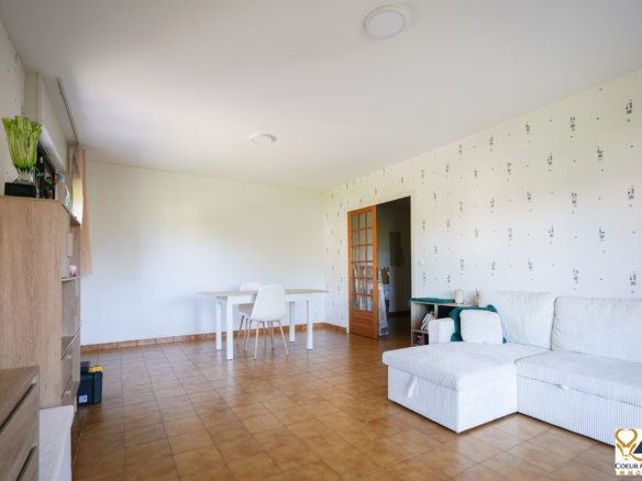 Entrée avec placards, cuisine équipée, belle pièce de vie avec poêle à granulés donnant accès sur une véranda lumineuse, deux chambres, une salle d’eau et un wc indépendant.