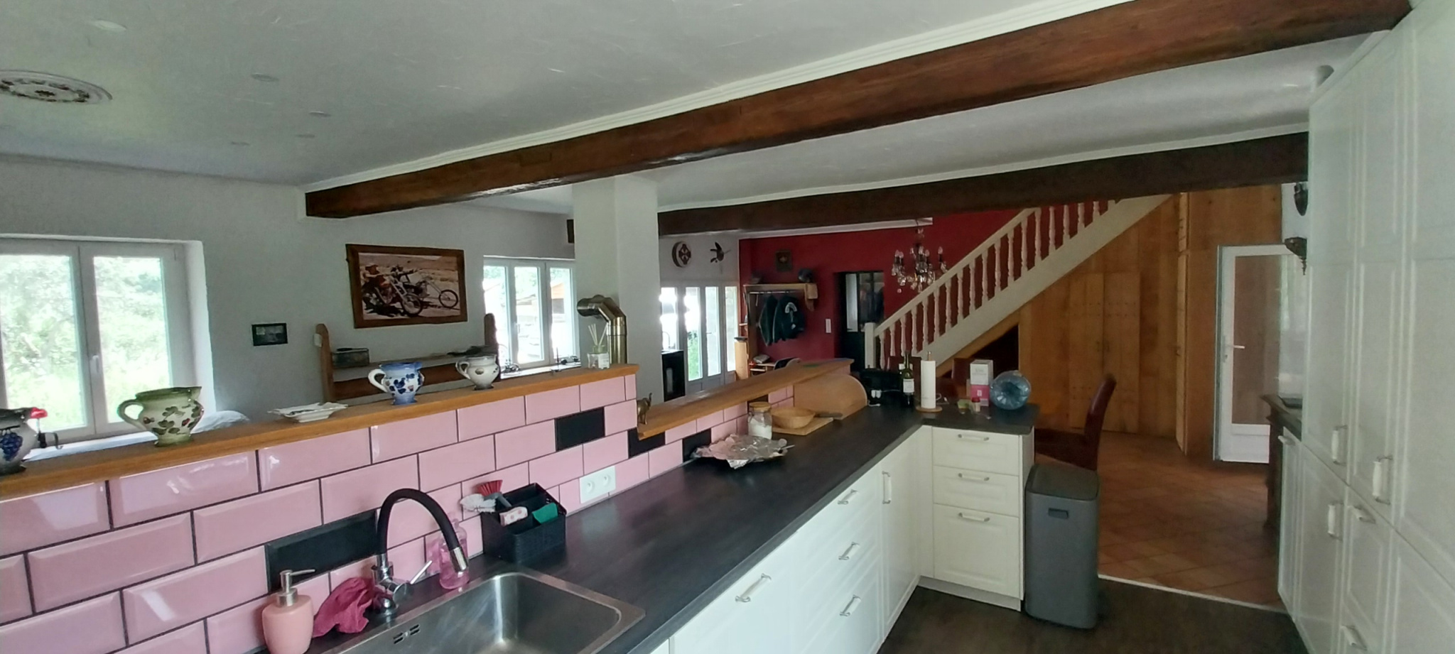 Rez-de-chaussée : Spacieux séjour avec cuisine ouverte, convivial et lumineux ; Accès direct à un local technique ; Pièce de rangement ; Atelier ; Cave