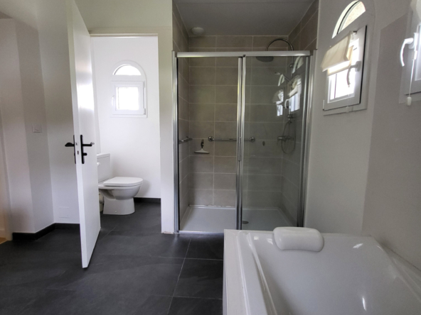 Elle comprend 5 chambres spacieuses, idéales pour accueillir une grande famille ou aménager des espaces de travail. La grande pièce de vie indépendante, baignée de lumière naturelle grâce à de larges ouvertures en double vitrage, offre un espace chaleureux et convivial, parfait pour recevoir.